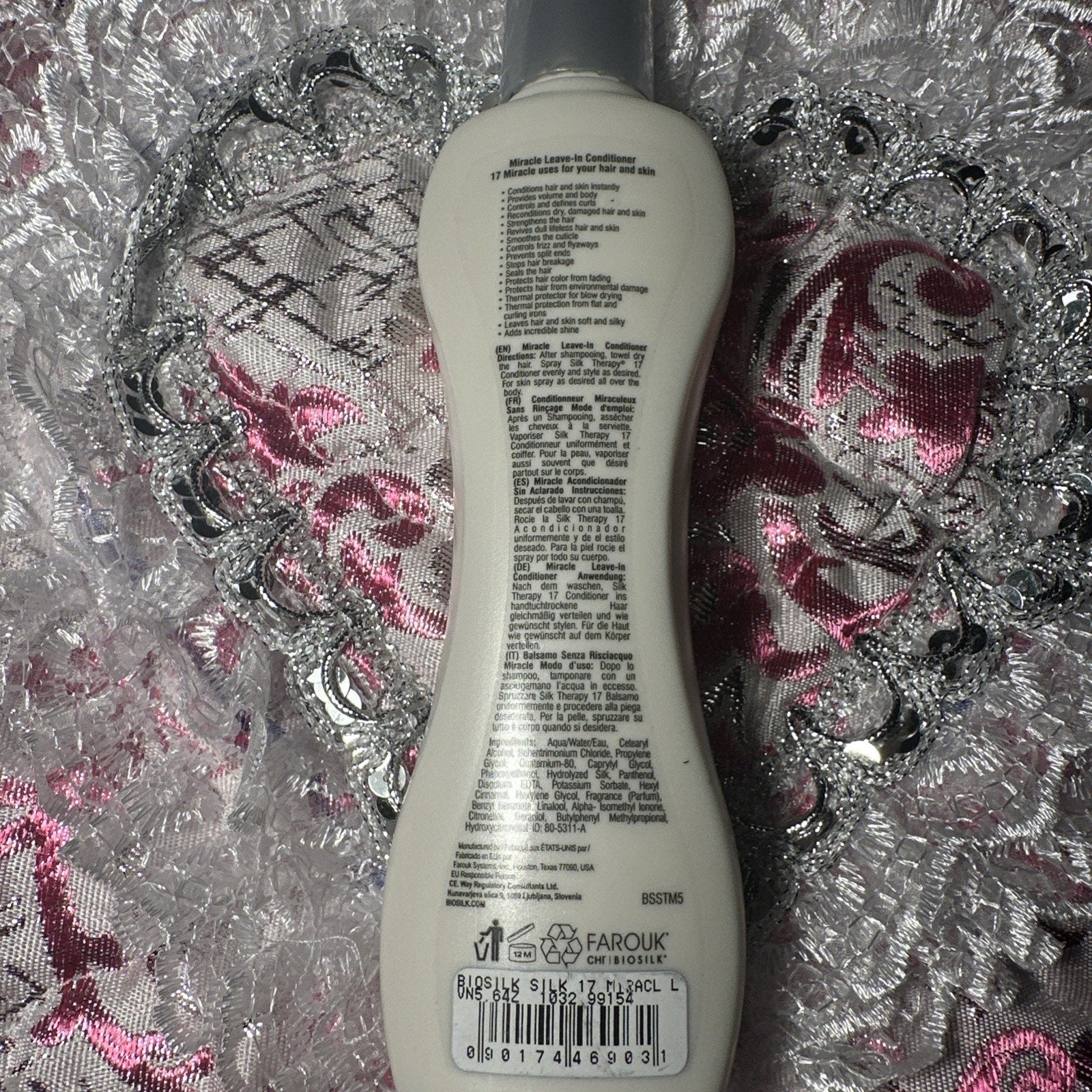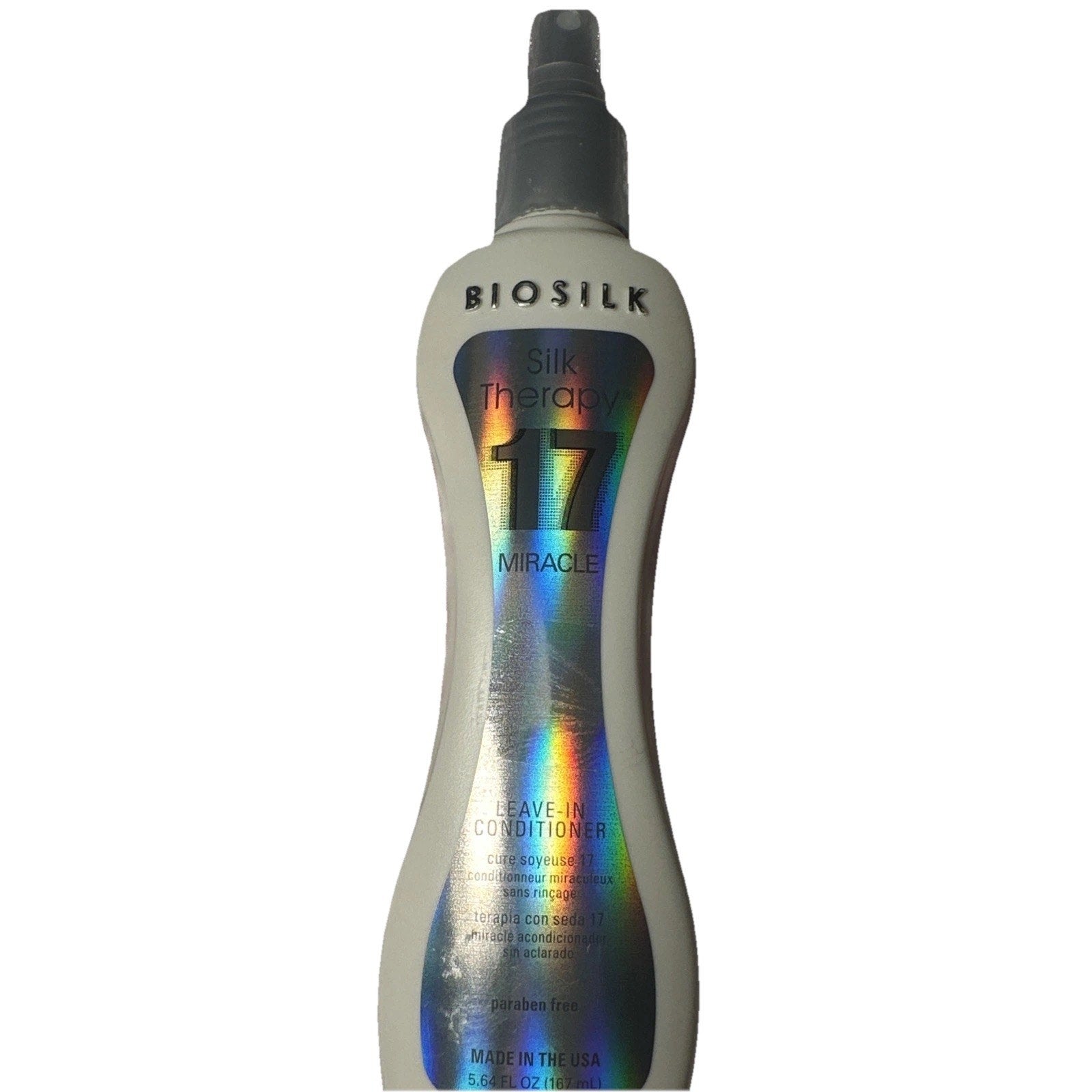 Missing plastic cap. New. The Biosilk Silk Therapy 17 Miracle Leave-in Conditioner is a 5.64 oz spray formulated with glycerin and keratin as its active ingredients. It is designed to enhance curls, provide volume, and prevent frizz for all hair types. This unisex product from the Biosilk brand also helps prevent split ends and stops hair breakage, making it a versatile and effective styling solution for achieving healthy and beautiful hair. Its fresh scent adds a pleasant touch to the overall experience.
