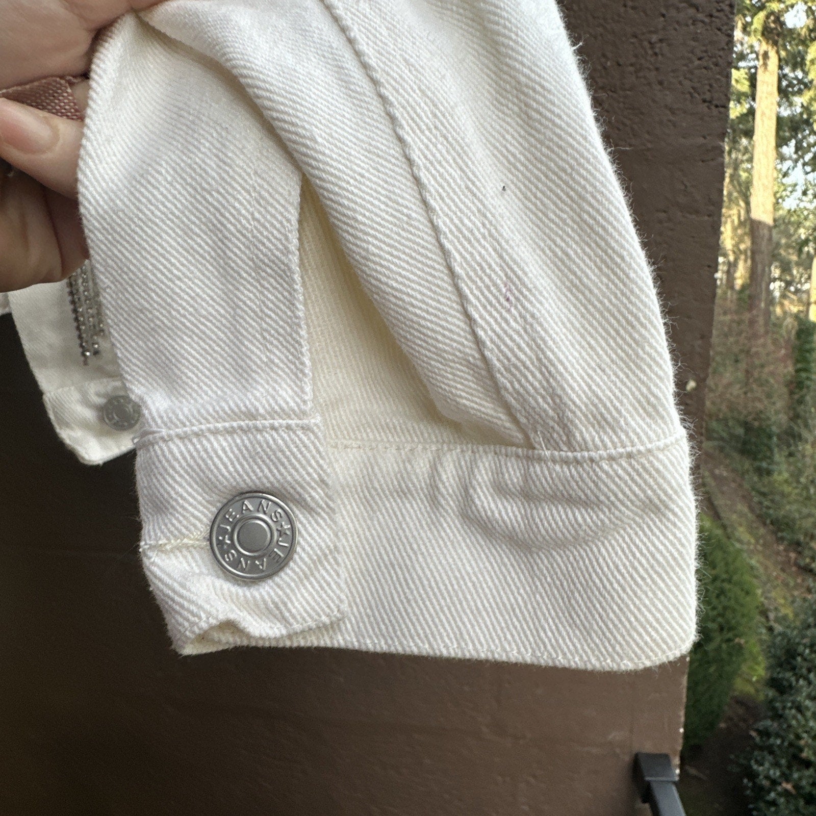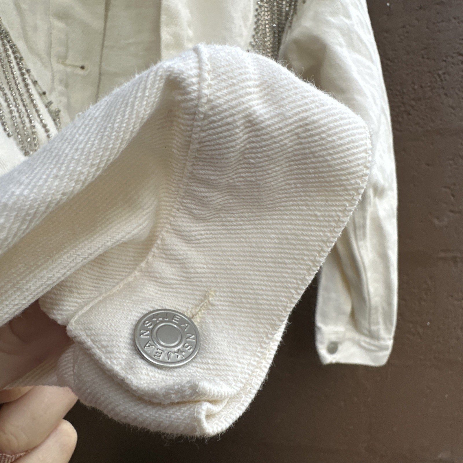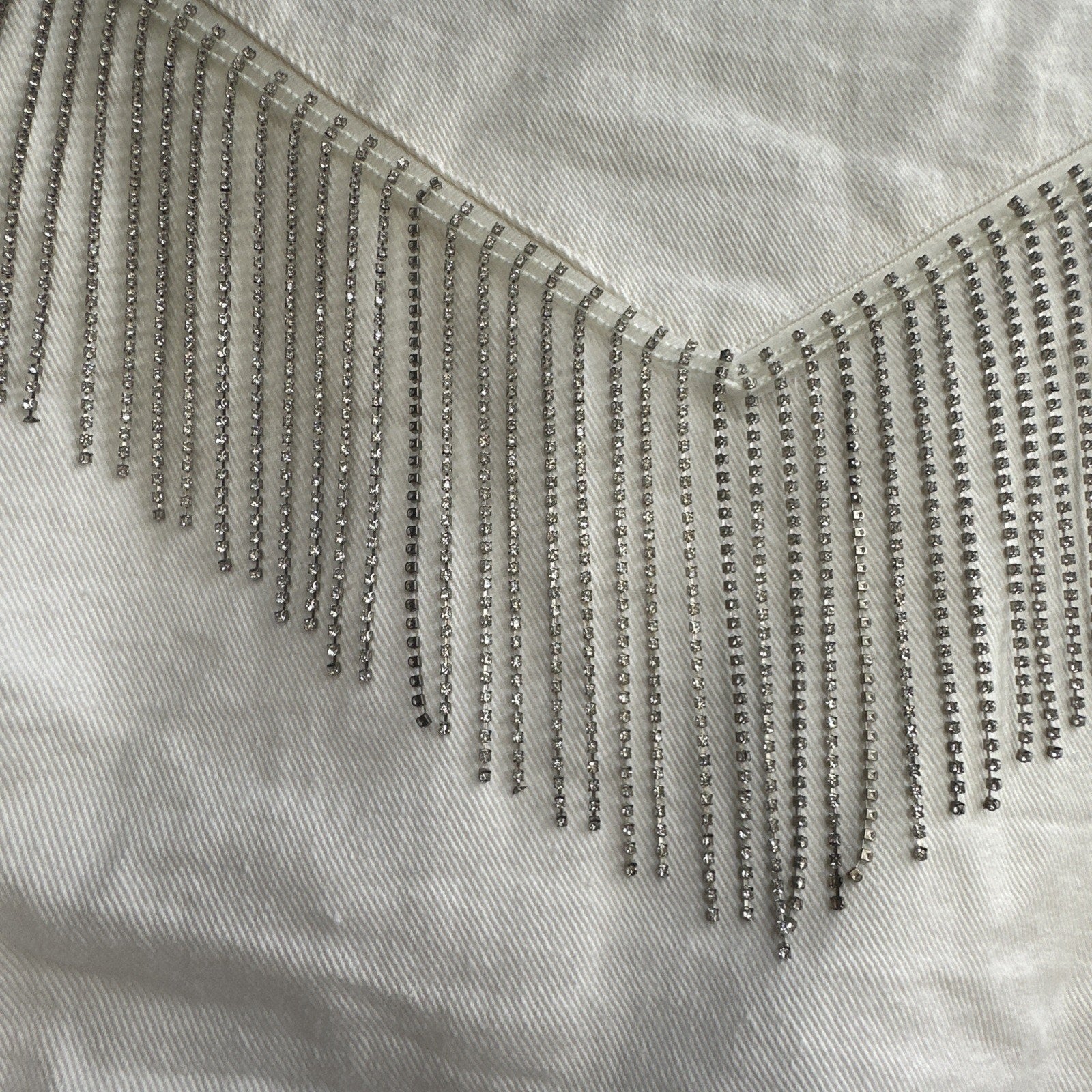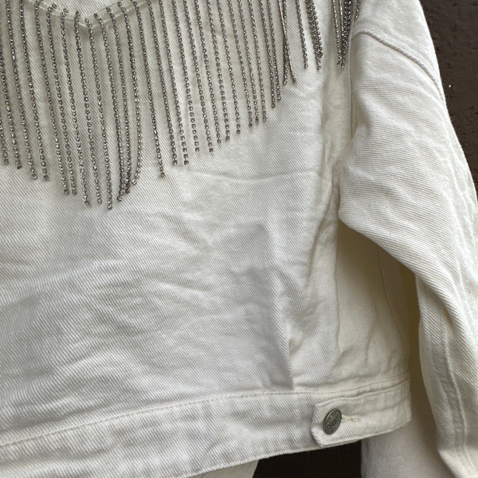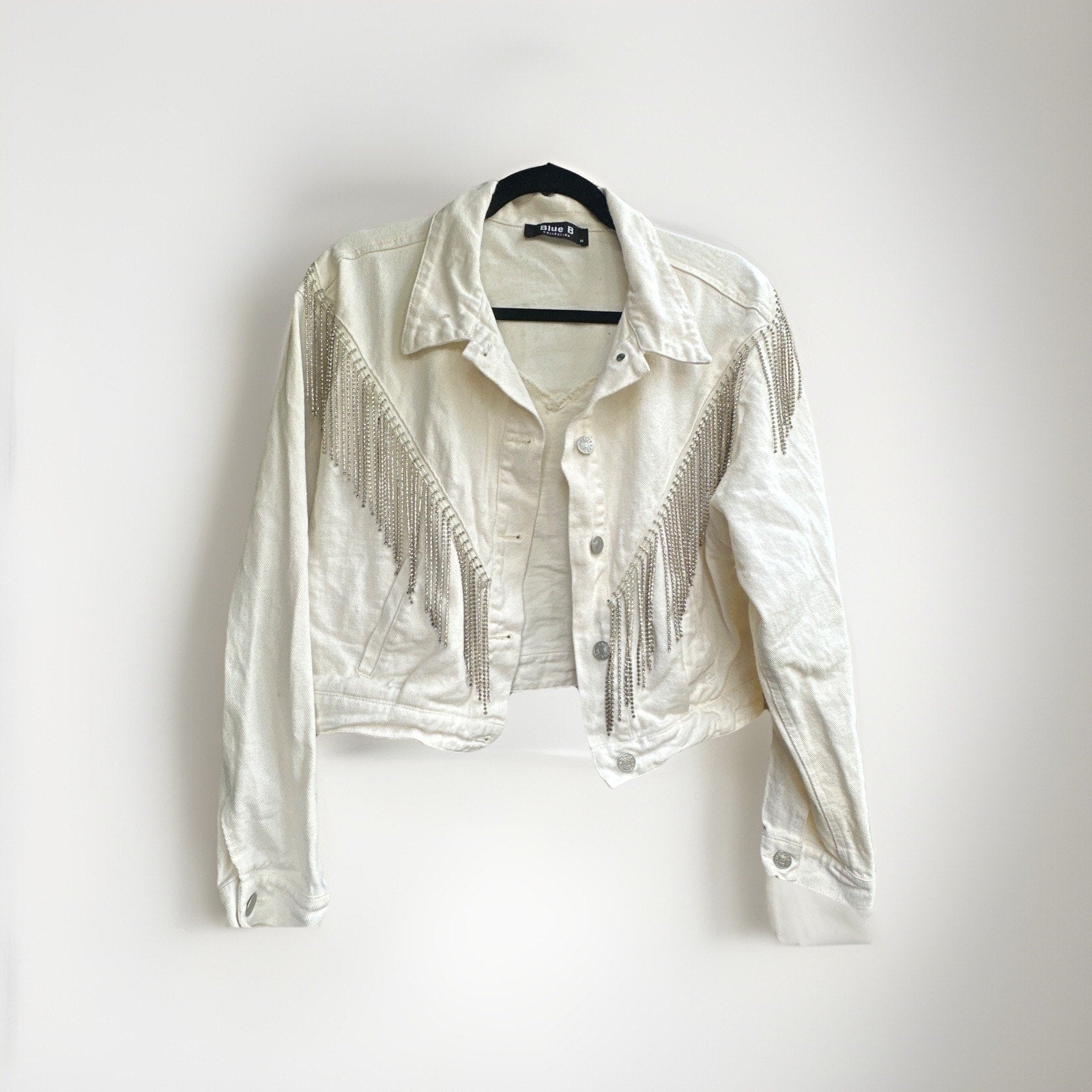 Blue B White Denim Fringe Button Jacket Rhinestone Tassel Cowgirl Cropped Size M