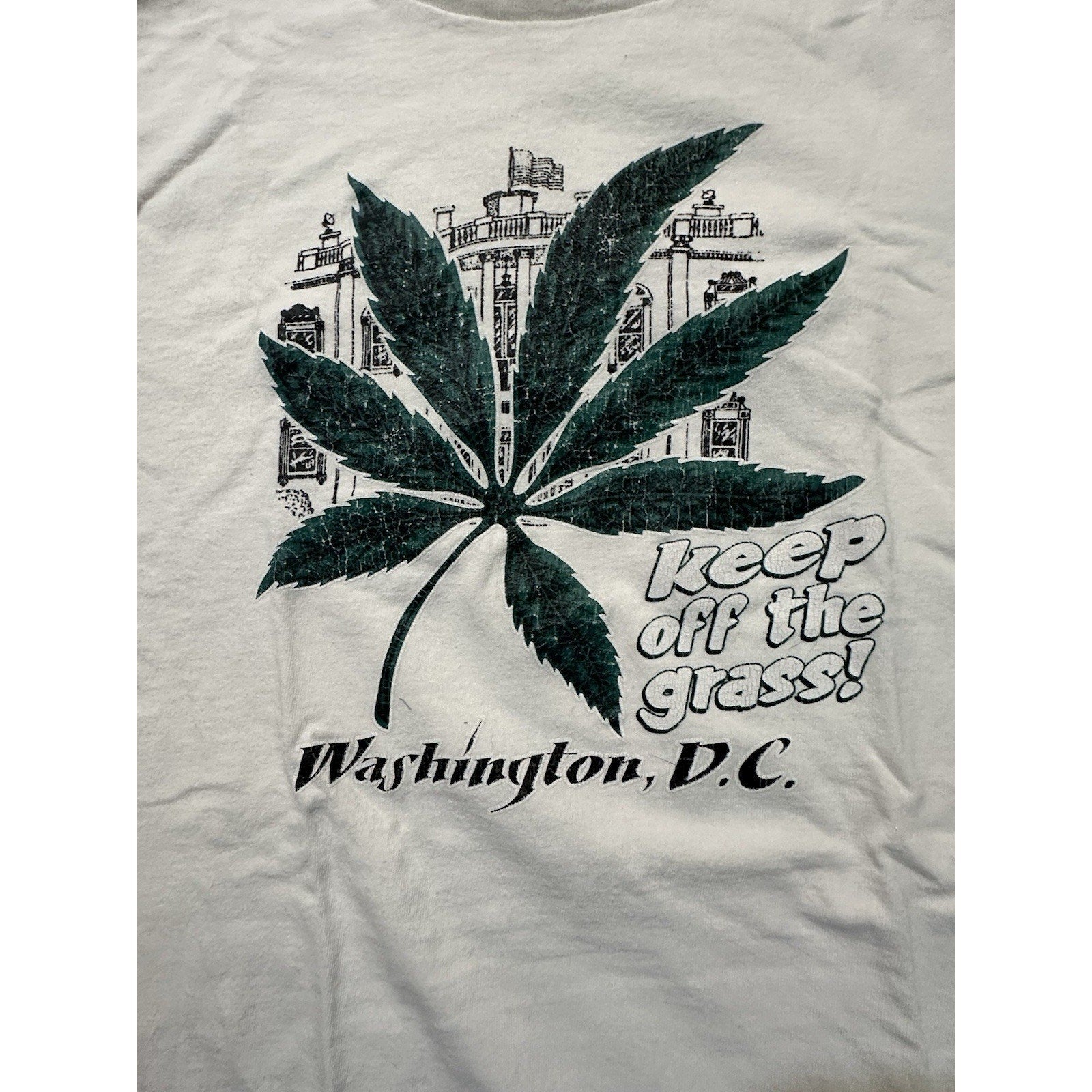 The product is a vintage single stitch t-shirt featuring a graphic design of Washington Keep Off The Grass. The shirt is made of cotton material in white color with a crew neck and short sleeves. It is designed for men and available in size XL. The brand of the shirt is Delta Pro weight, known for its quality and durability. Perfect for individuals who appreciate a unique and retro style with a touch of cannabis humor.