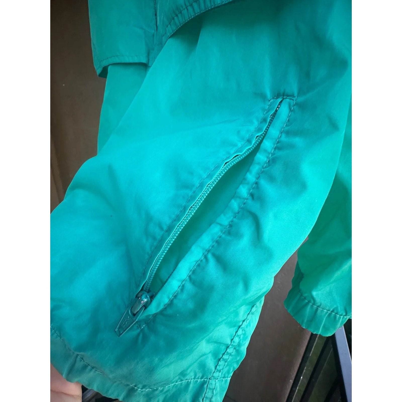 Embrace a retro aesthetic with this vintage Eddie Bauer women's windbreaker jacket in a vibrant teal color. Crafted from 100% nylon with an acrylic coating, this lightweight jacket features a breathable mesh lining for comfort. It is designed with a full-zip front, a cozy ribbed collar, secure zippered hand pockets, and a drawstring hem for an adjustable fit. This classic outerwear piece is a women's size Large, offering a comfortable fit perfect for layering.