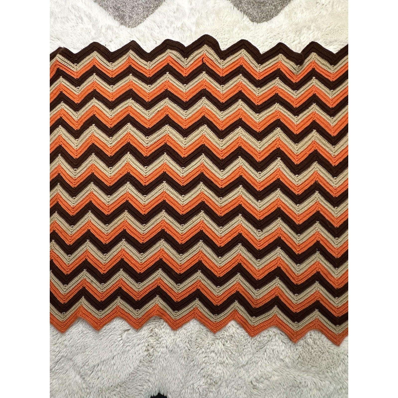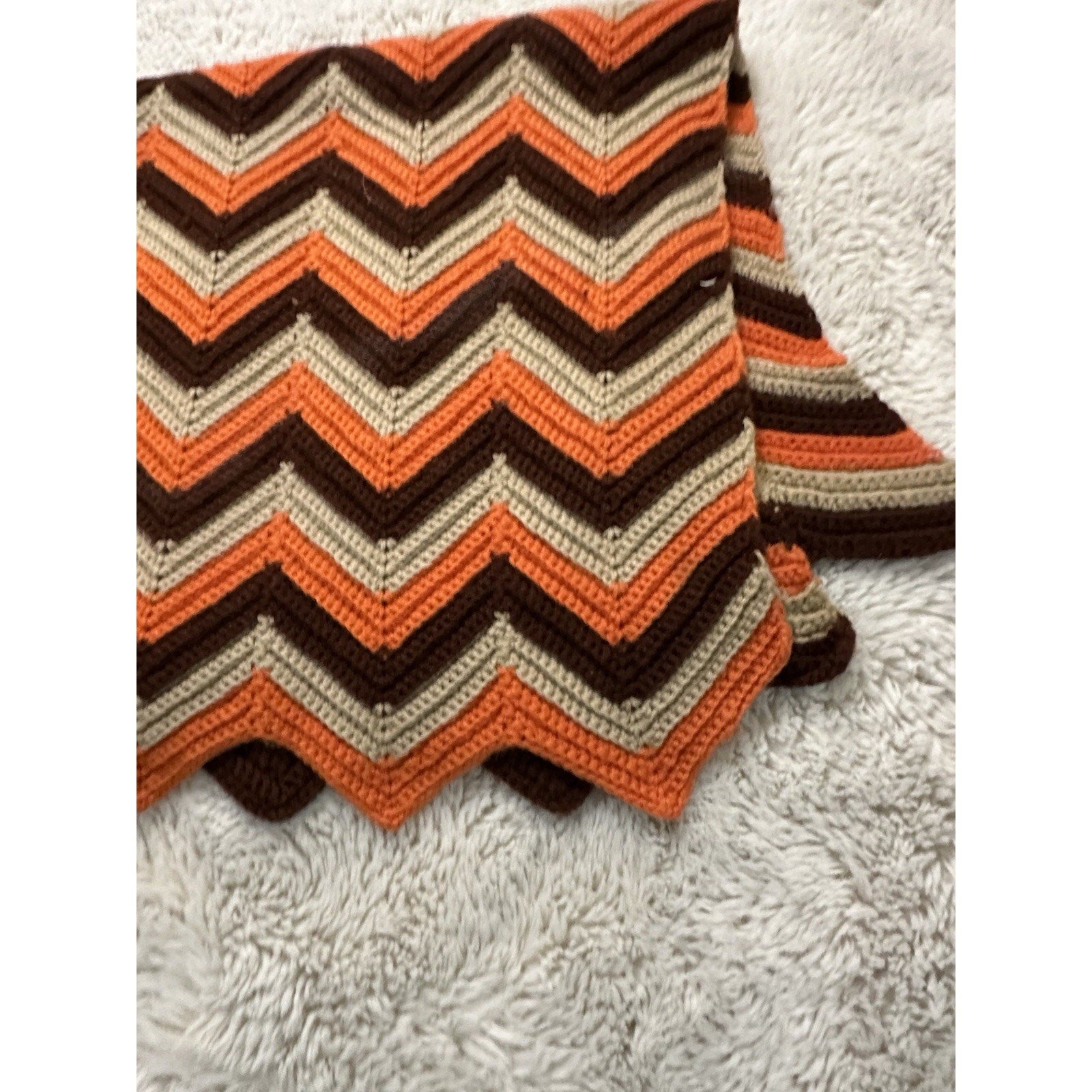 Handmade Chevron Yarn Blanket Afghan 54"x40" Orange Brown Hand Crochet