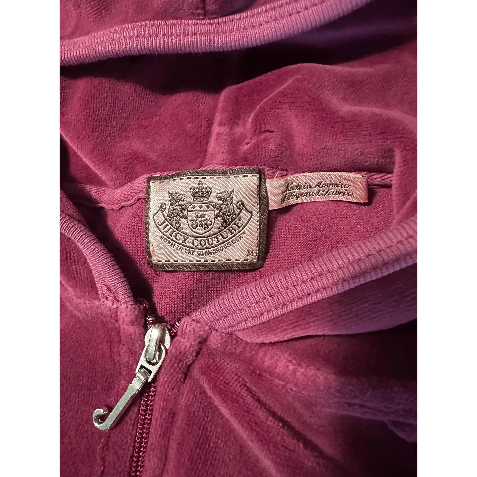 This authentic Juicy Couture Women's velour tracksuit hoodie jacket in a vibrant pink offers a quintessential Y2K vintage style, perfect for a chic and comfortable look. Crafted from a soft velour blend of 80% cotton and 20% polyester, it features a full-zip front with a signature "J" pull, a hood, and two front kangaroo pockets for convenience. This size Medium jacket, style JGMU0001, was made in the U.S.A. with imported fabrics, embodying the brand's iconic early 2000s aesthetic. It presents in excellent pre-owned condition, ensuring a stylish addition to your wardrobe.