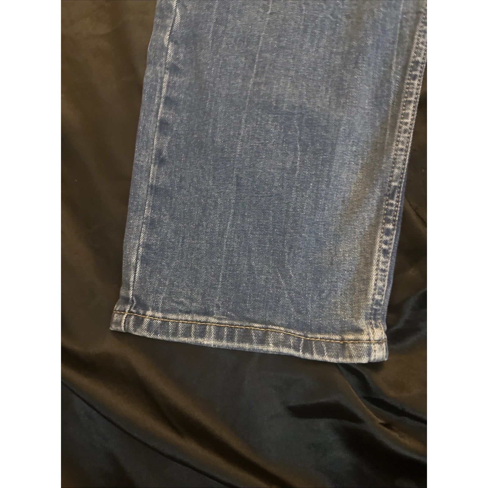 The product is a pair of vintage Levi's jeans in a relaxed fit with a medium fabric wash. Made from a cotton blend denim material, these jeans feature a classic 5-pocket design and straight leg style. The waist size is 36 inches, the inseam is 32 inches, and they are machine washable for easy care. The color is blue, making them versatile for various casual outfits.