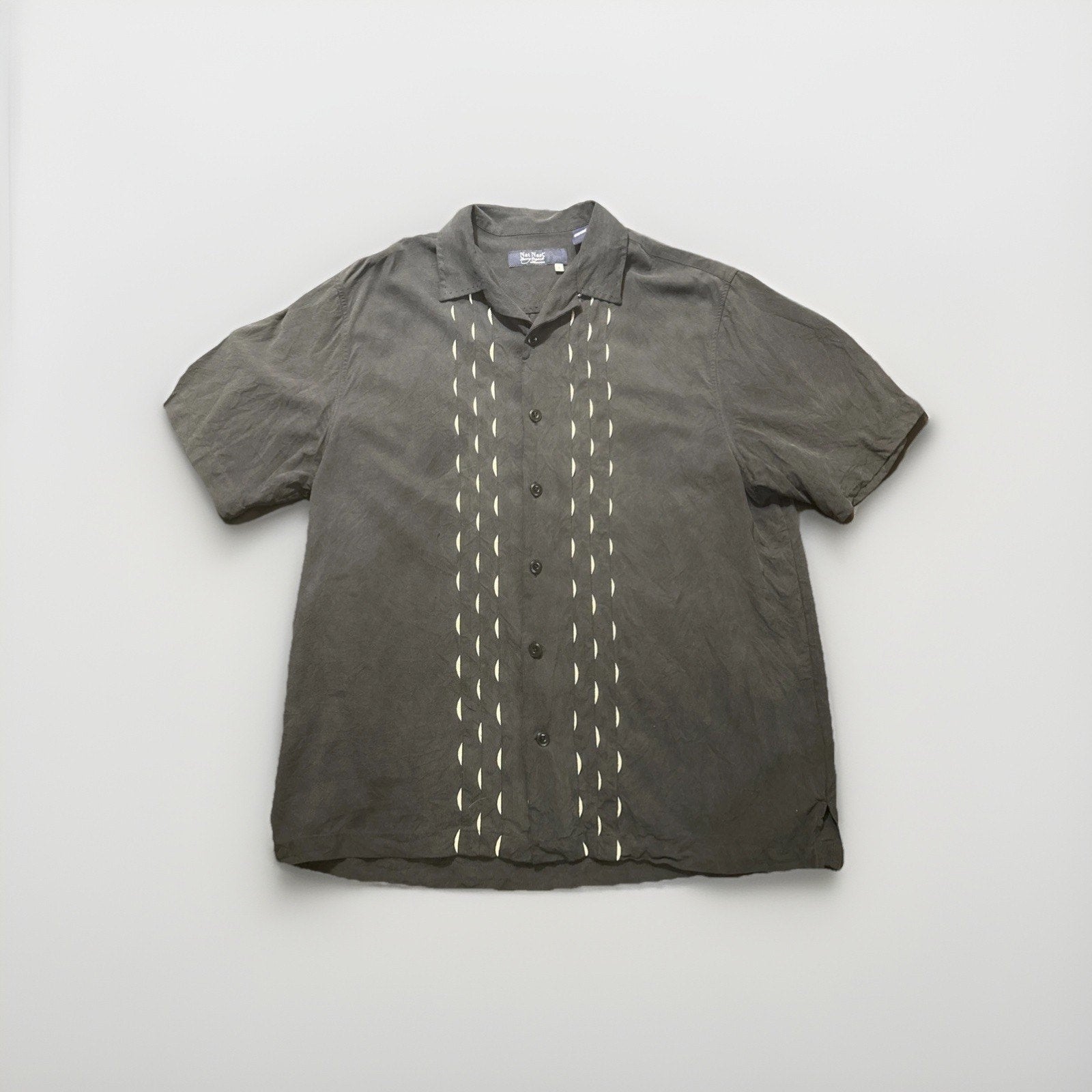 The product is a black button-up shirt by the brand Nat Nast in size L. It features a solid pattern, short sleeves, a collared neckline, and button closure. Made from silk, this shirt is designed for a regular fit and is ideal for men looking for a stylish yet casual option for their wardrobe.