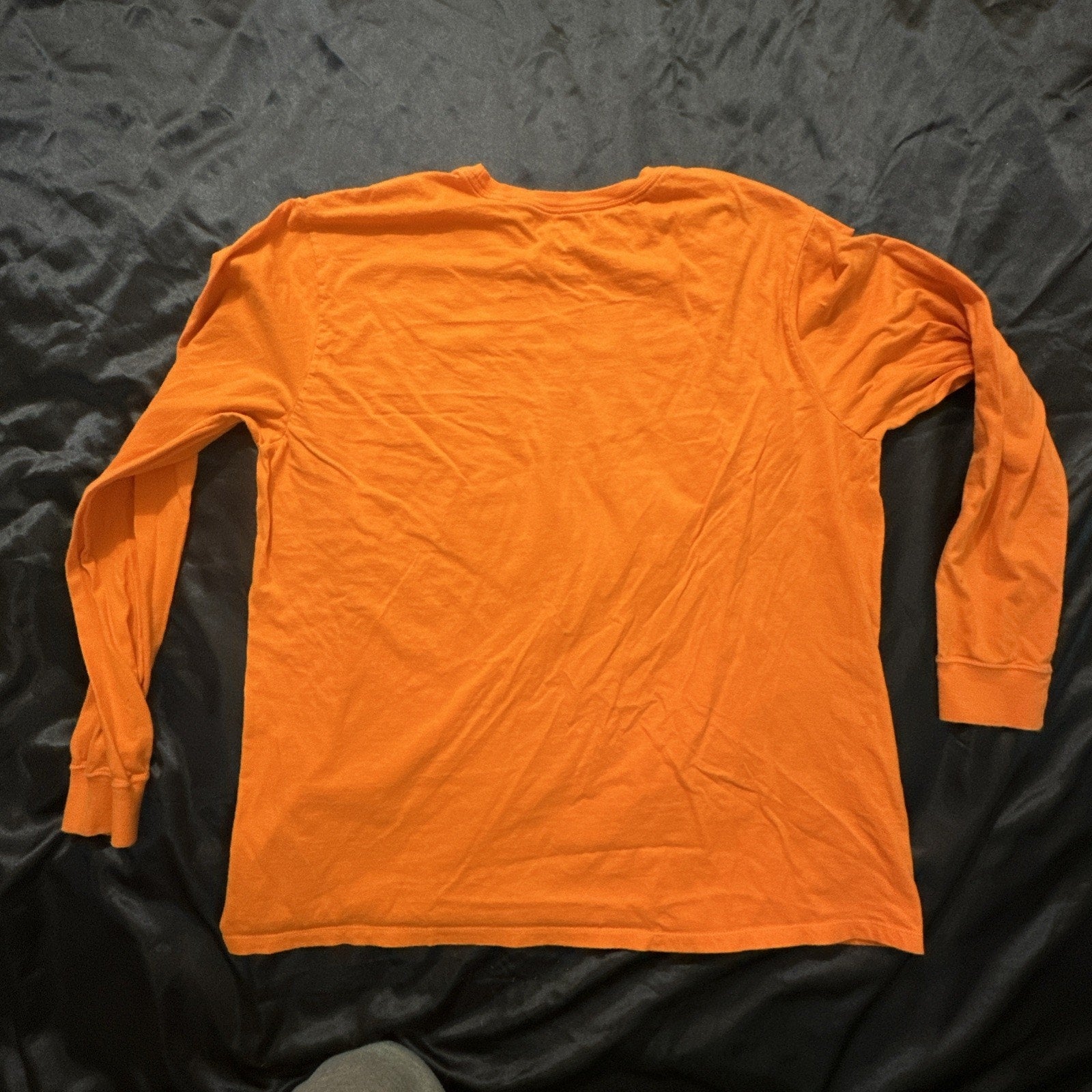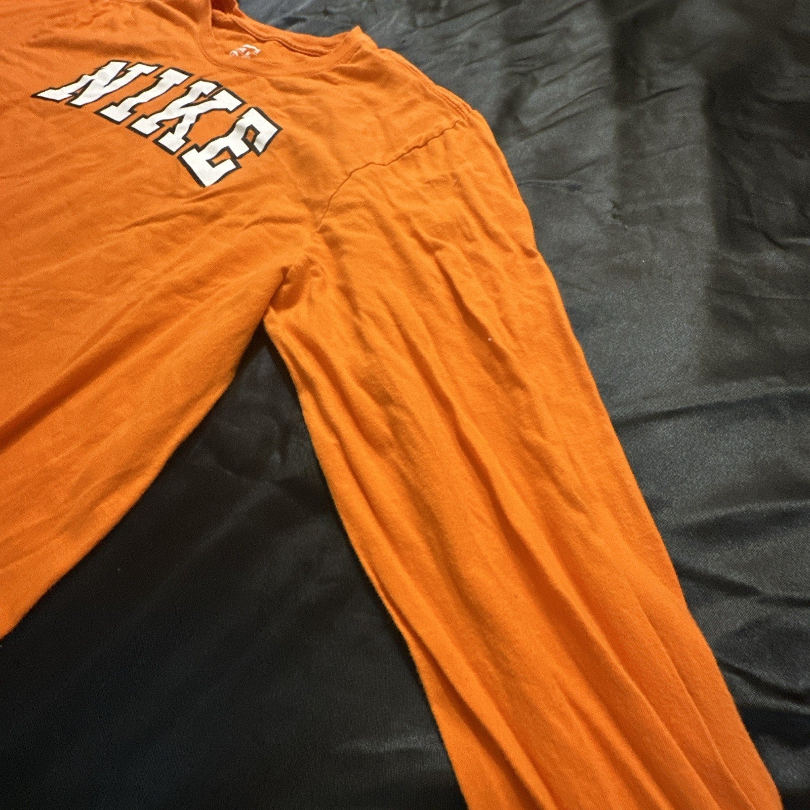 The product is a Nike men's long sleeve t-shirt in size 2XL, featuring a solid orange color made of cotton material. It has a regular fit with a crew neck neckline, suitable for activewear occasions. The t-shirt is designed for men who prefer a regular size and is ideal for those looking for a comfortable and stylish activewear top.