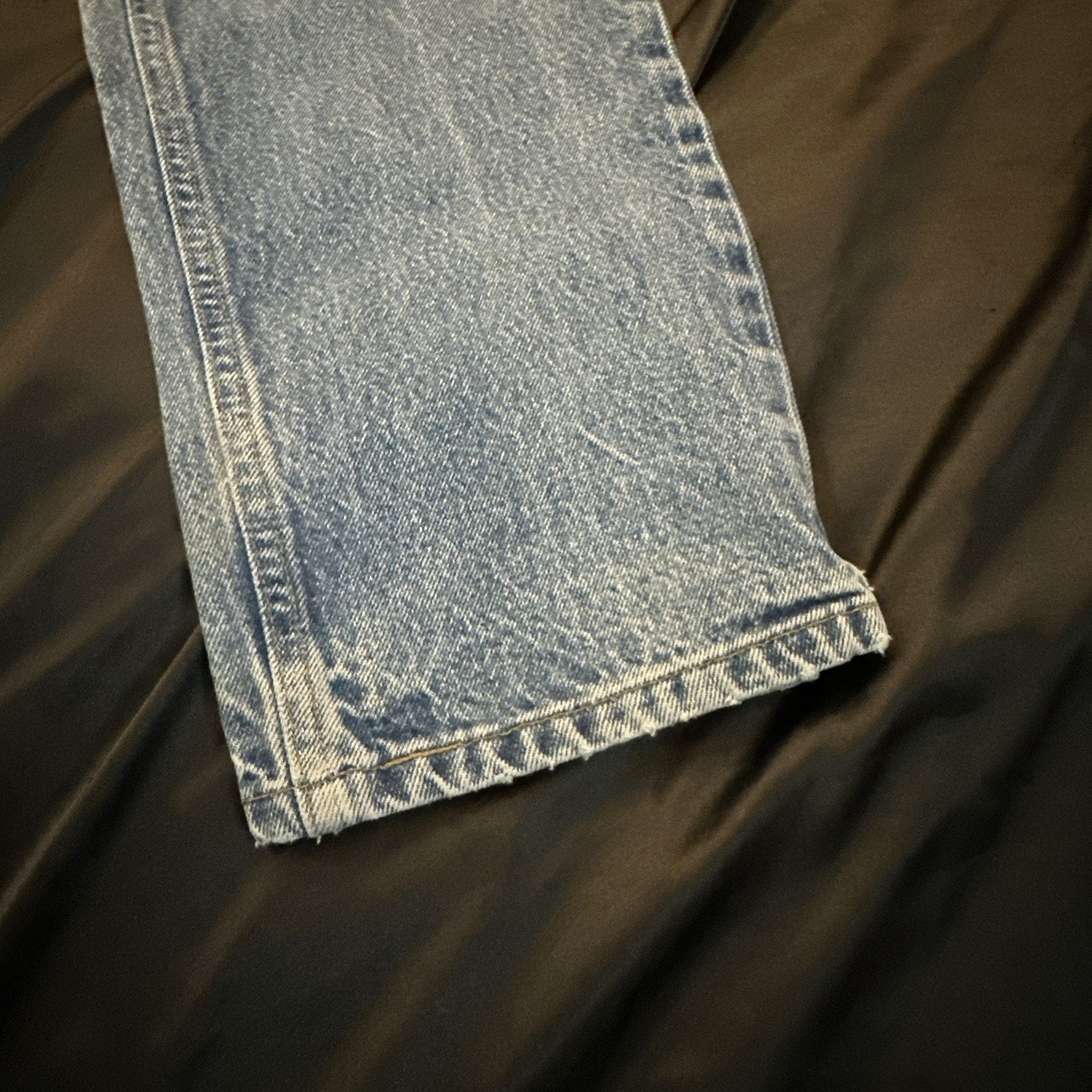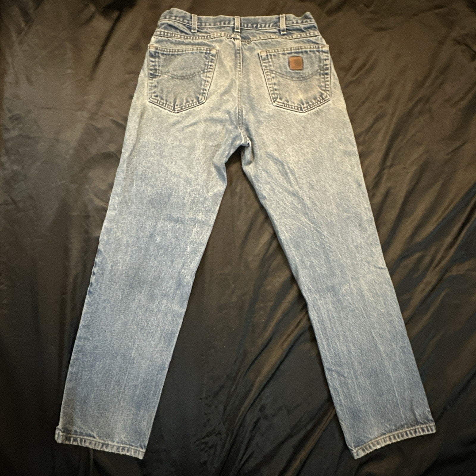 The 1B11 Vtg Carhartt B17-STW Men's Relaxed Jeans in stonewash blue are a vintage pair of denim pants from the 1990s. Featuring a relaxed fit with a 32-inch inseam and 34-inch waist size, these jeans are the perfect addition to any casual wardrobe. Made from durable denim material, these original Carhartt jeans have a classic grunge look that adds a touch of nostalgia to any outfit.