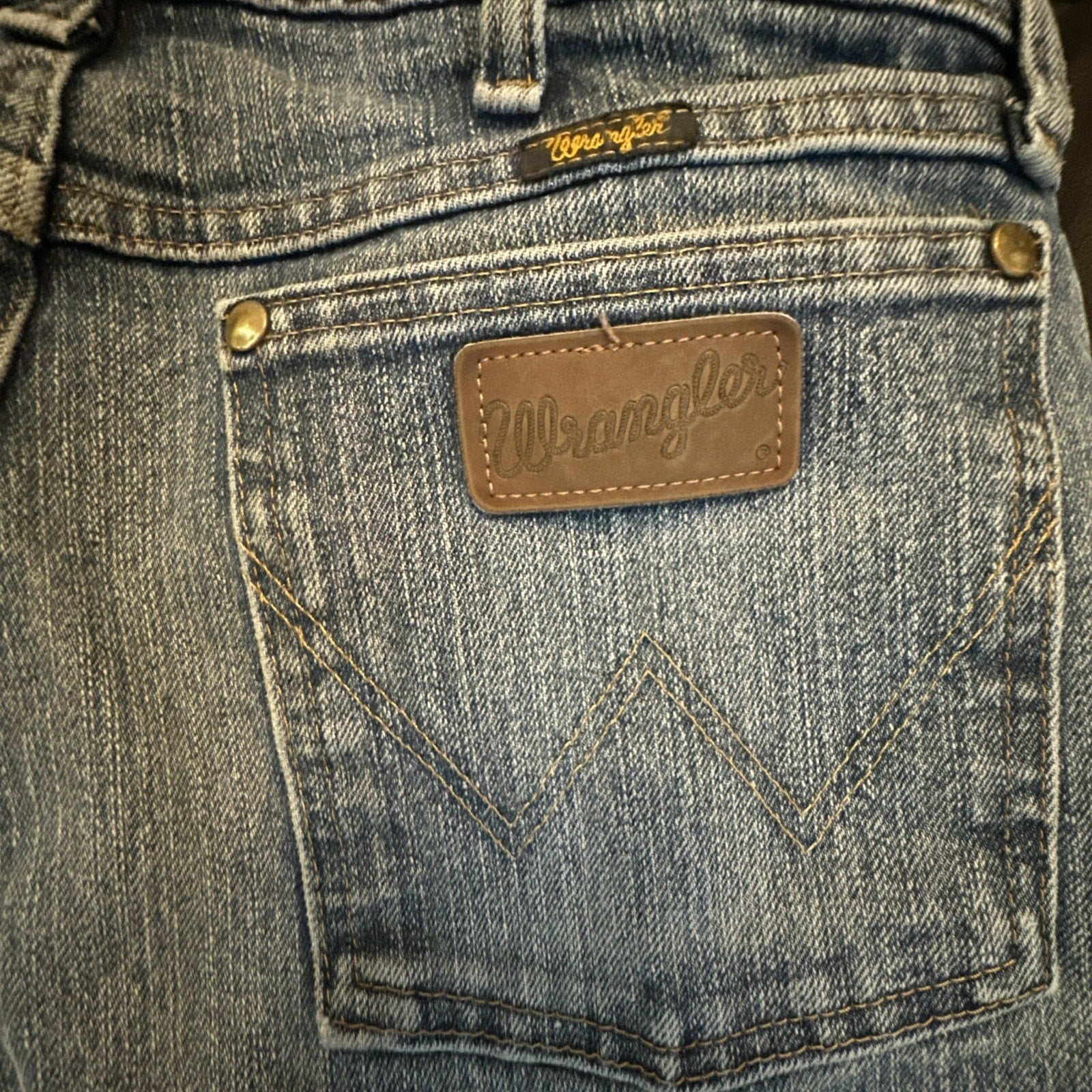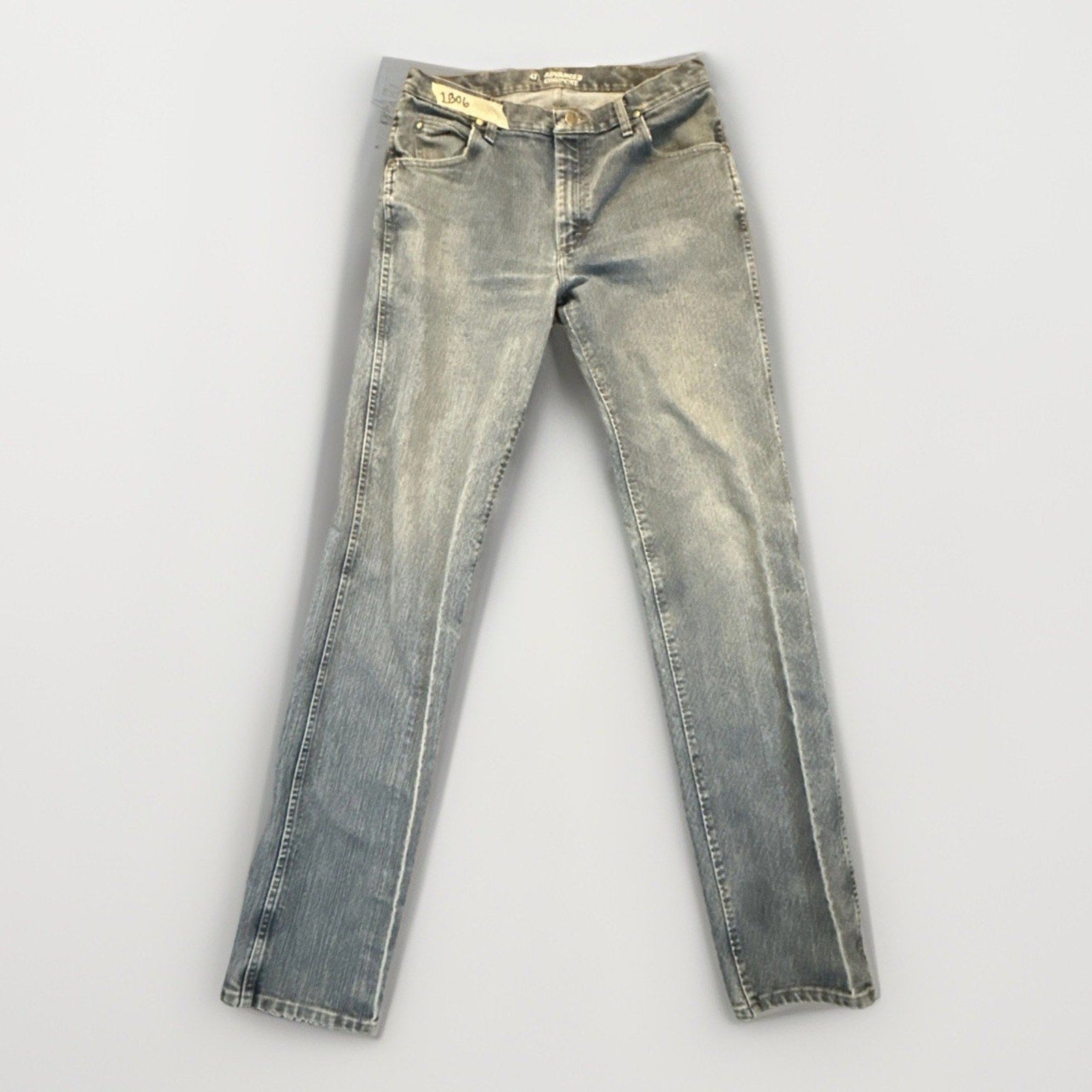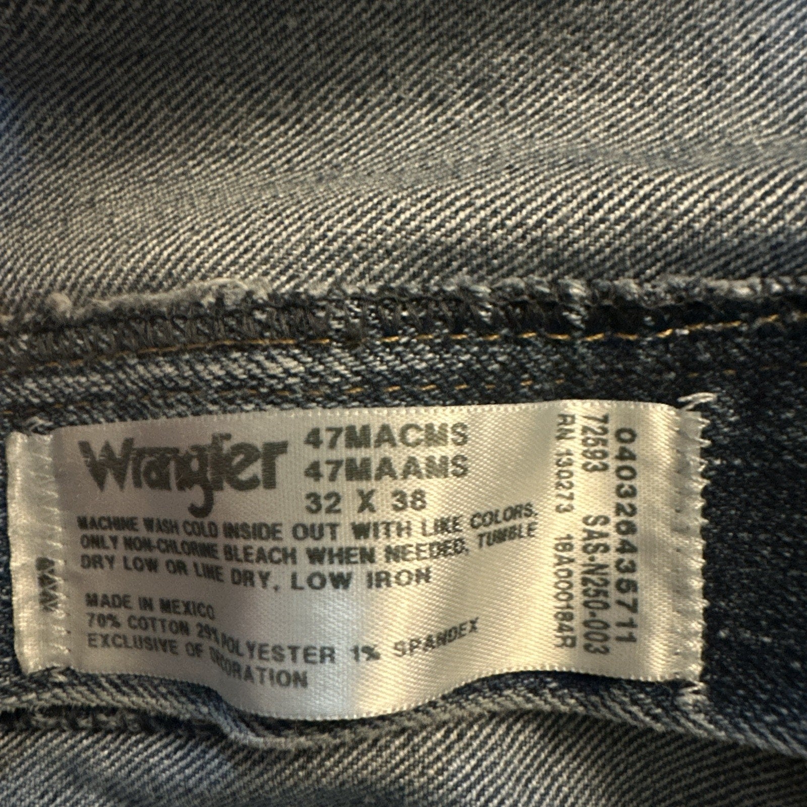 The product is a pair of men's vintage Wrangler jeans in size 32 with a regular fit and a 38-inch inseam. Made of cotton in a classic blue color, these jeans are a timeless piece of clothing that exudes a rugged and stylish look. The Wrangler brand is known for its durability and quality, making these jeans a reliable choice for everyday wear or special occasions.