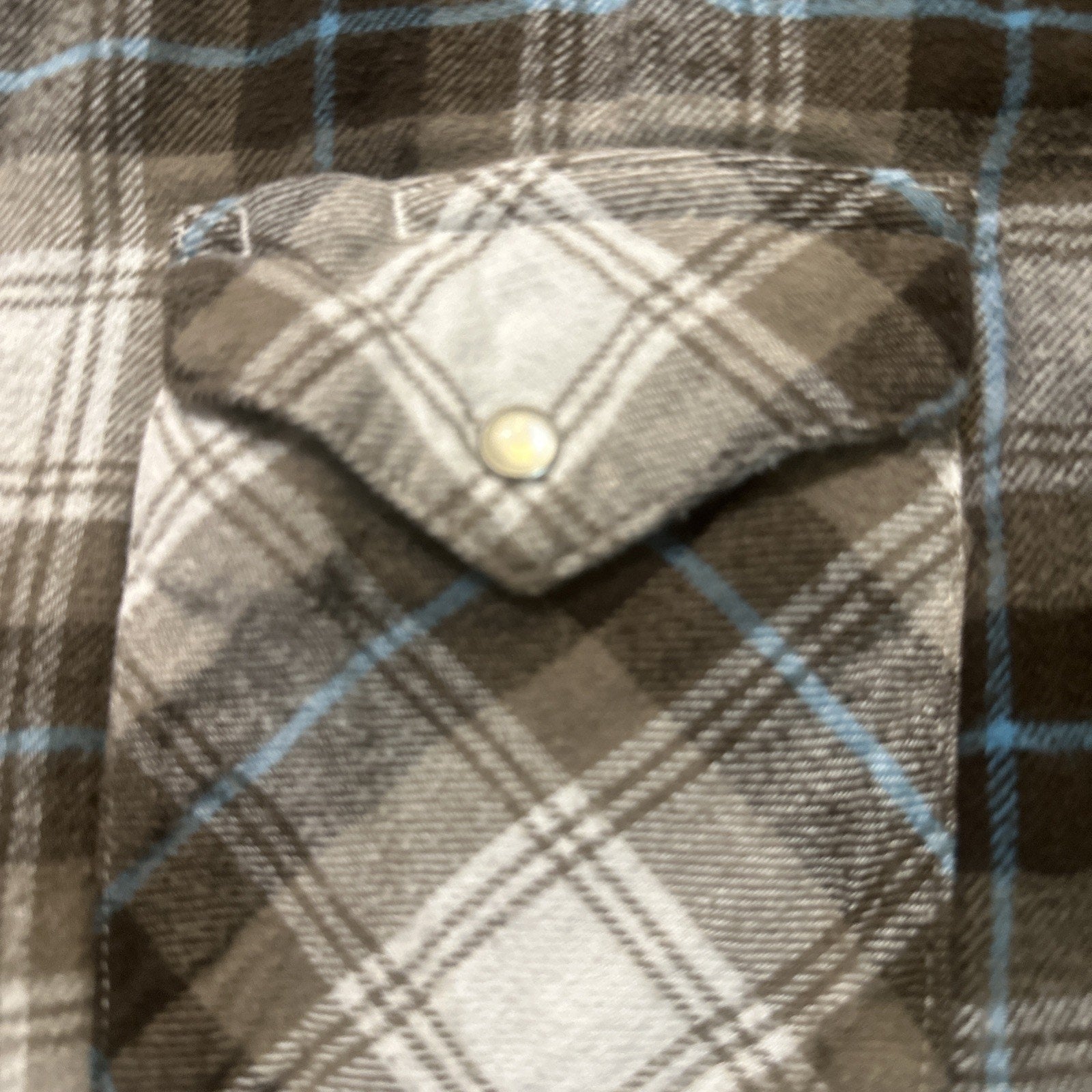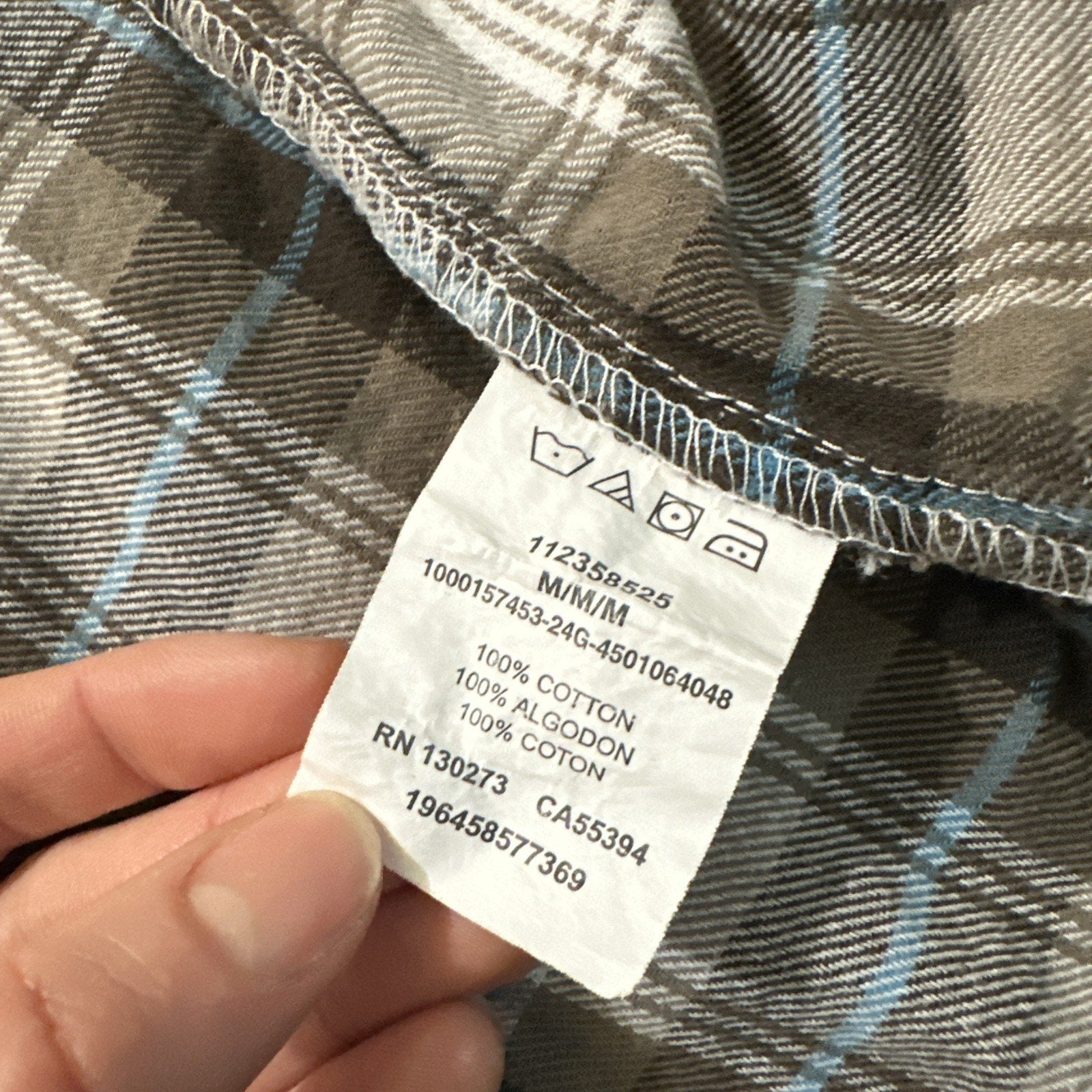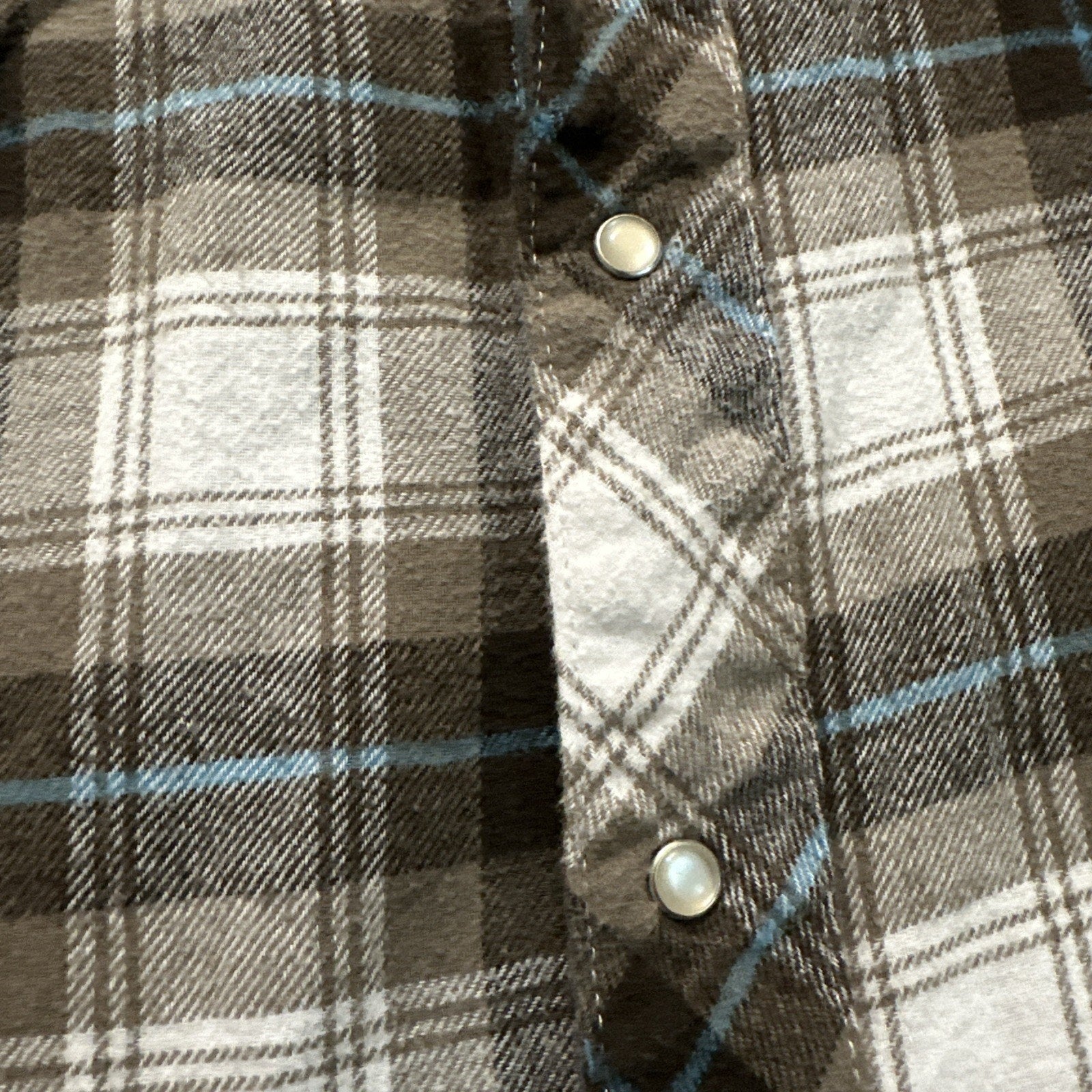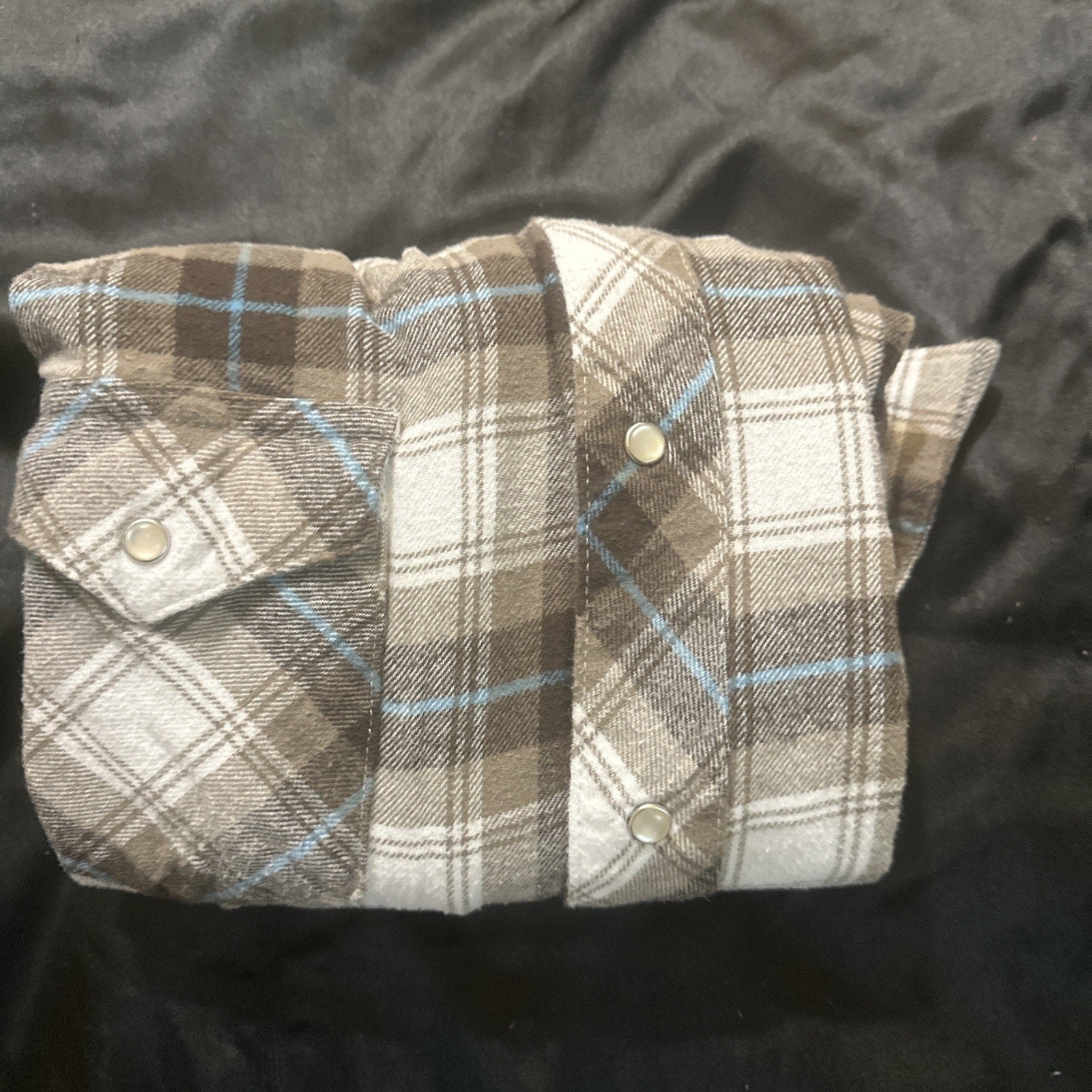 The Wrangler Plaid Casual Button Down Shirt for women in size M features a classic collared neckline and snap closure, perfect for a relaxed and stylish look. Made of soft cotton material in a brown plaid pattern, this shirt is ideal for everyday wear. With its long sleeves and regular fit, this shirt offers both comfort and versatility, making it a timeless addition to any woman's wardrobe.